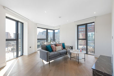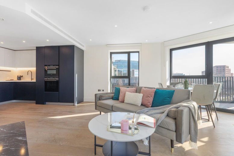 This chic apartment boasts a large, open-plan living and dining area carefully planned to optimize natural light and space. With its high-end appliances and modern finishes, the fully integrated kitchen is ideal for entertaining as well as daily use. Dual-facing and floor-to-ceiling windows afford lots of natural daylight to enter the property. Master bedroom with a walk-in wardrobe, luxurious stone finish en-suite shower room, and private exclusive balcony. Good size 2nd double bedroom, further family bathroom, ample storage in the hallway, an internal storage room, utility room.